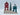 This gorgeous little scene features two charming houses, one red and one green, with a metal pine tree nestled in between.