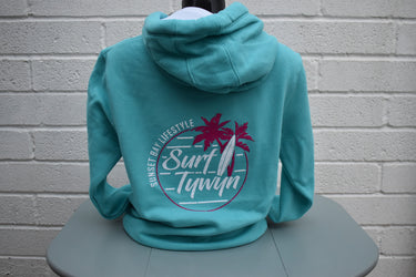 Ladies Blue Hoody "Surf Tywyn Pink Palms"