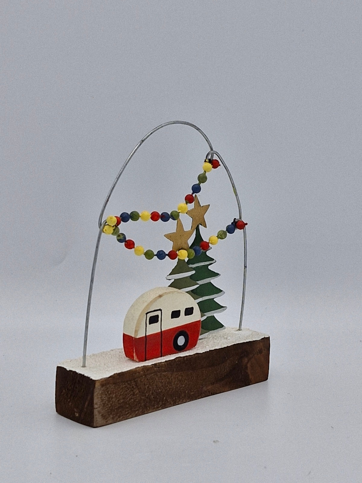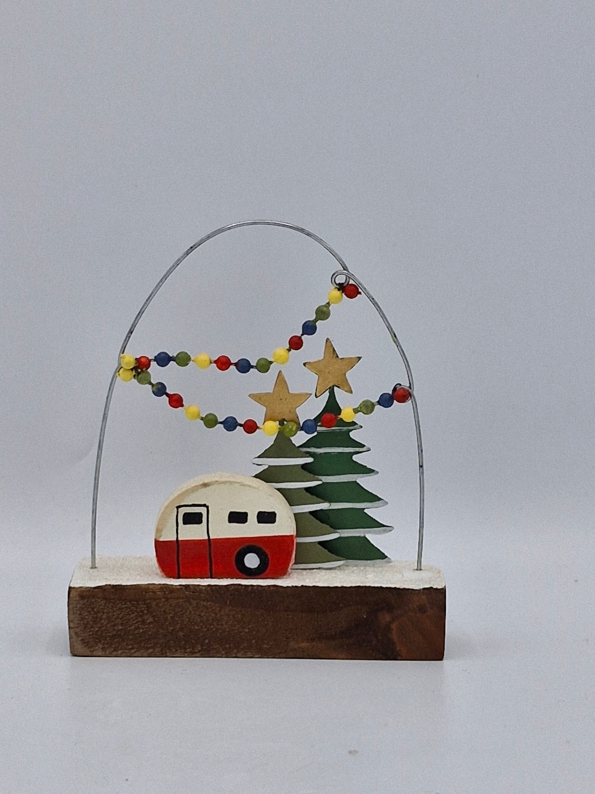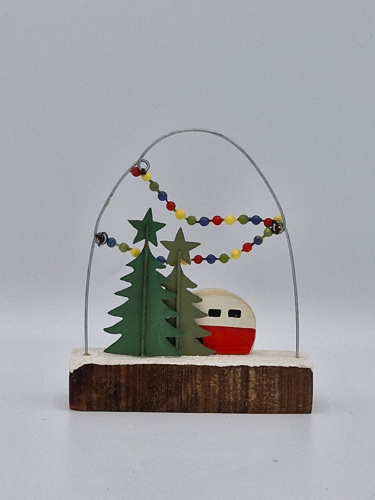 Step into a winter wonderland with this festive scene featuring a charming red caravan nestled among snow-dusted Christmas trees. The beaded mock lights add a festive atmosphere, creating the perfect cozy holiday vibe. Ideal for spreading cheerful Christmas spirit, this playful design brings warmth and joy to your festive decorations.