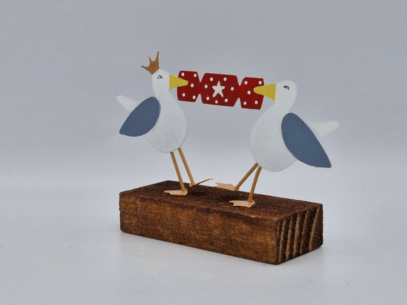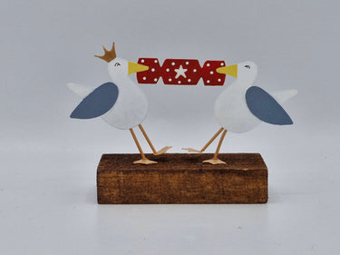 Bring a splash of seaside cheer to your holiday décor with this playful ornament featuring seagulls tugging at a festive Christmas cracker. Perched on a charming wooden base and topped with a bright paper crown, this whimsical decoration adds a fun, coastal twist to your celebrations. Perfect for those who love a bit of coastal charm and festive spirit all in one!