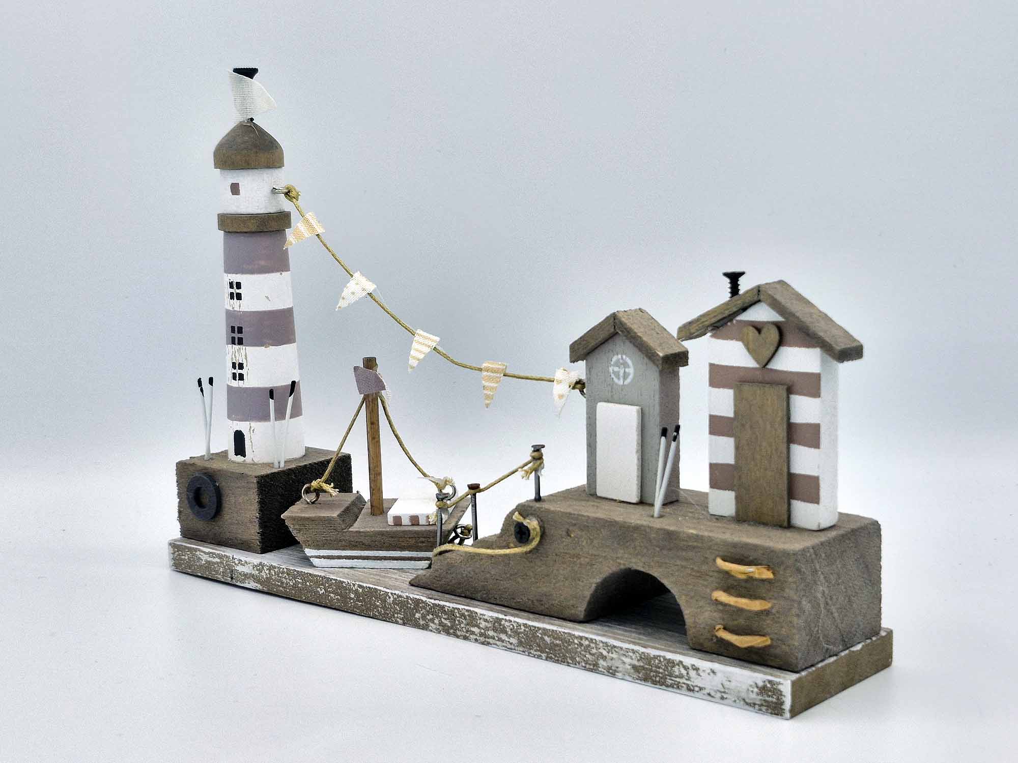A very cool gift! Funky driftwood look, hand-painted, freestanding wooden harbour and lighthouse with boat.