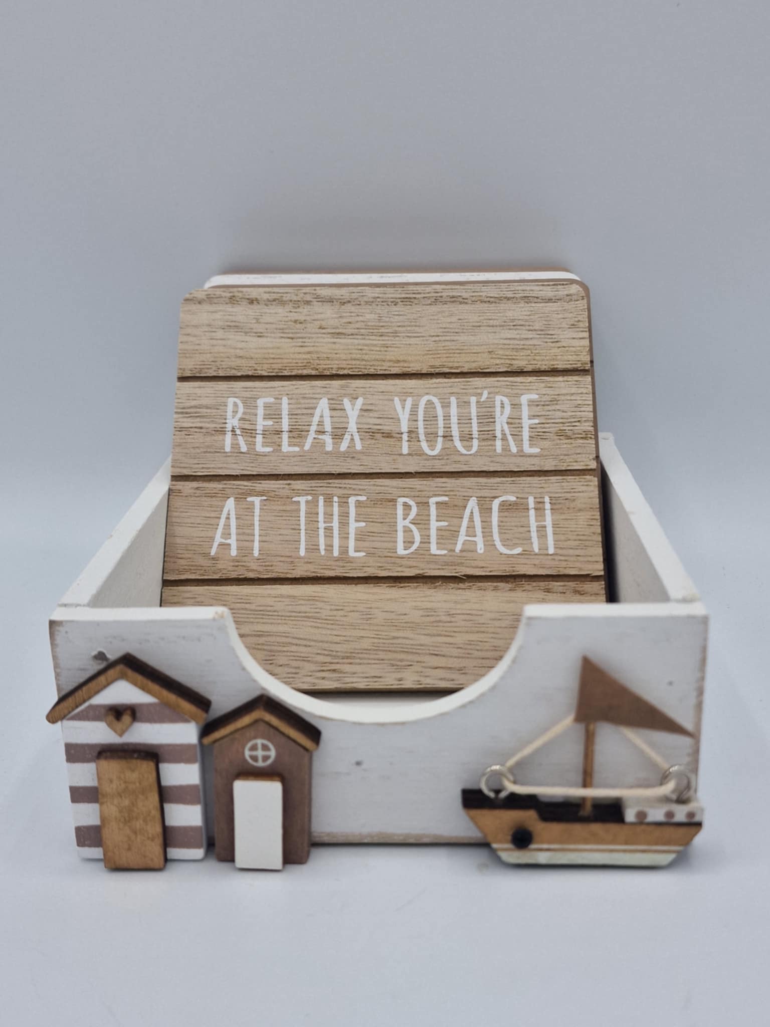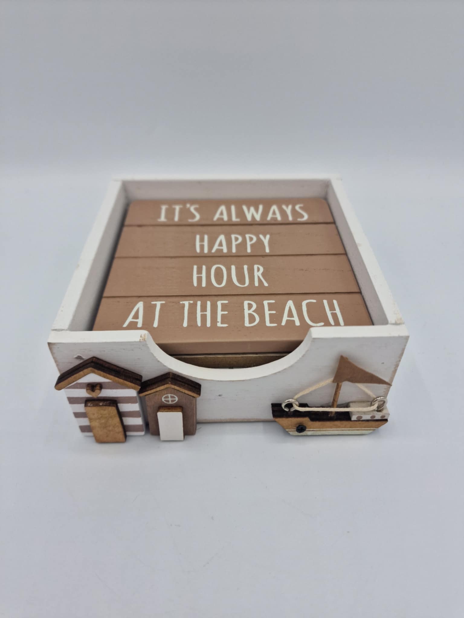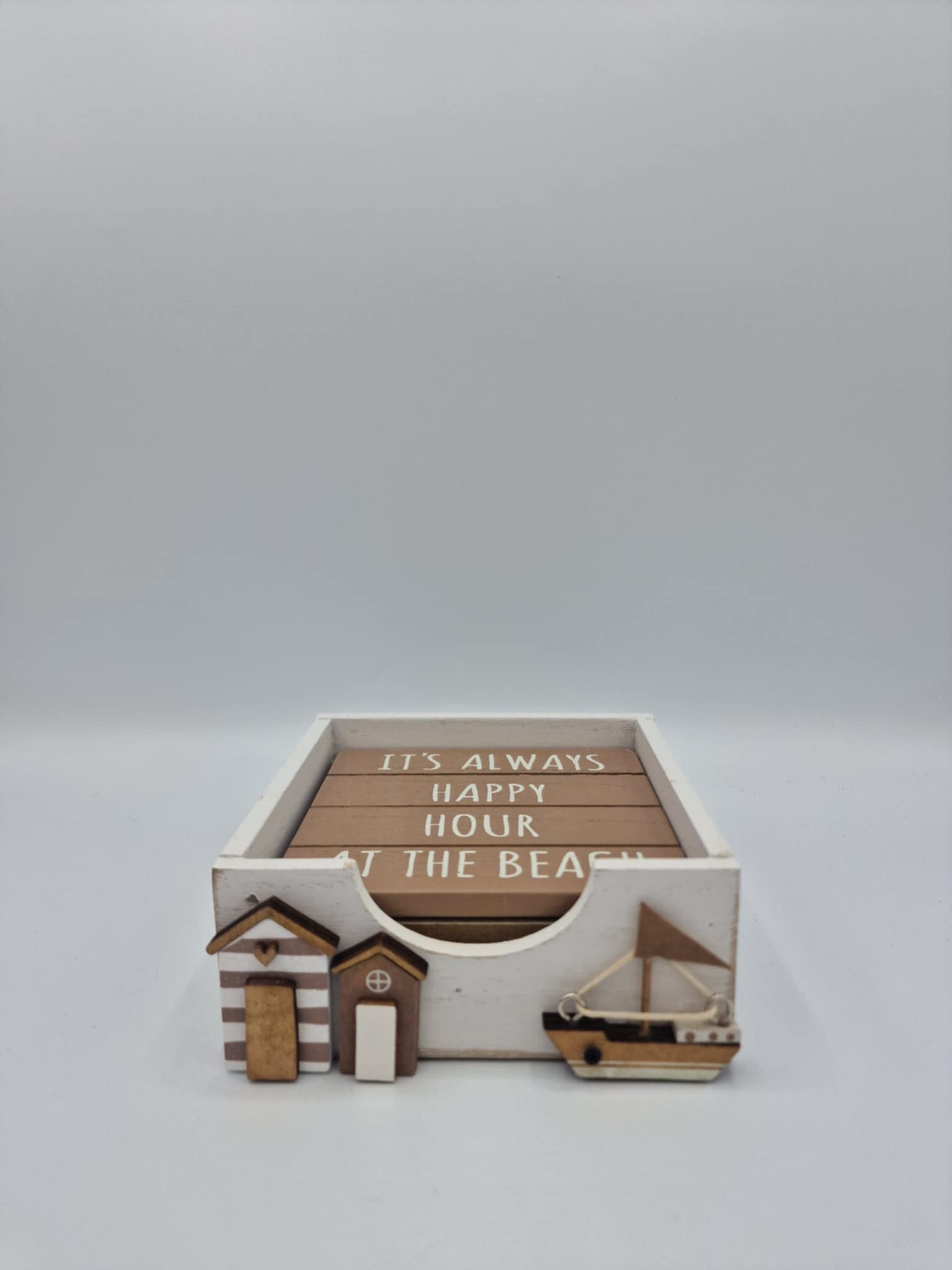Set sail into coastal charm with these delightful wooden coasters featuring nautical-inspired designs. Each of the four coasters showcases beachy themed quotes in warm, natural tones that bring seaside serenity to your home. Crafted from wood, they're perfect for protecting surfaces whilst adding a splash of beachy character to any room. Presented in an attractive display box adorned with beach huts and a sailing boat, they make an ideal gift for anyone who dreams of sandy shores and ocean breezes.