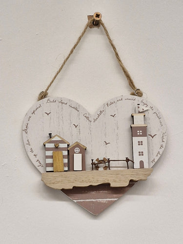 Featuring a picturesque harbour and lighthouse scene at its centre, it's framed by seaside-themed words in warm sandy and natural tones.