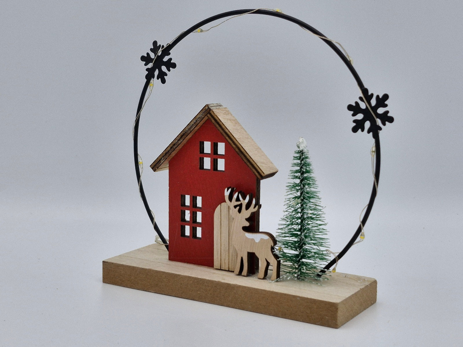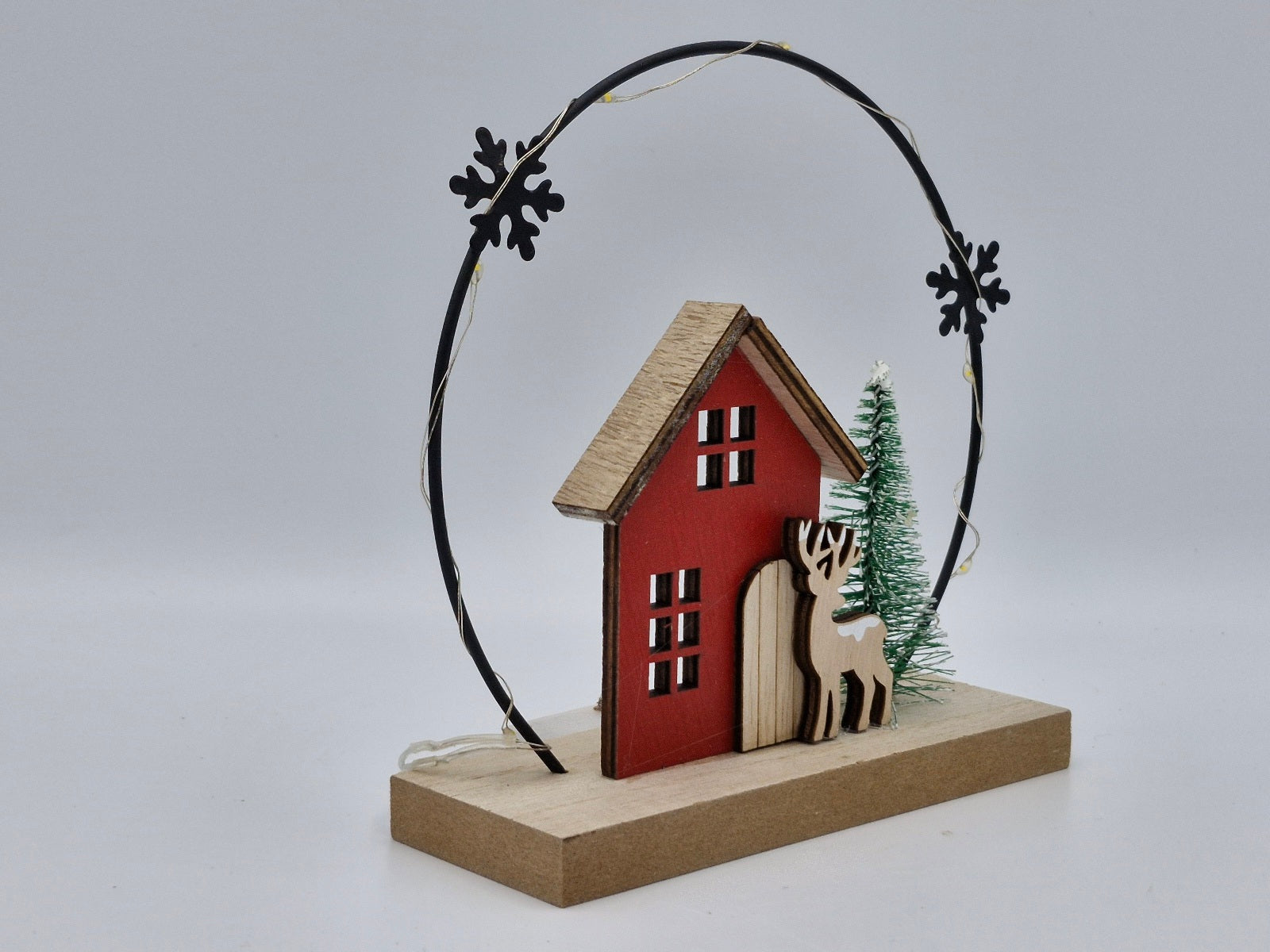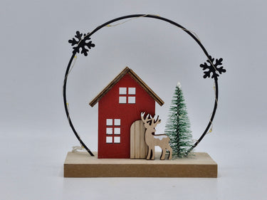 Bring festive cheer to your home with the "Reindeer Winter Cottage" LED Hoop. This charming decoration features a classic wooden cottage with a playful reindeer, delicate snowflakes, and a cozy Christmas tree, all illuminated by soft LED lights. Perfect for adding a magical winter glow to any room, it captures the spirit of the season with a whimsical touch. Create a joyful holiday atmosphere that delights children and adults alike.