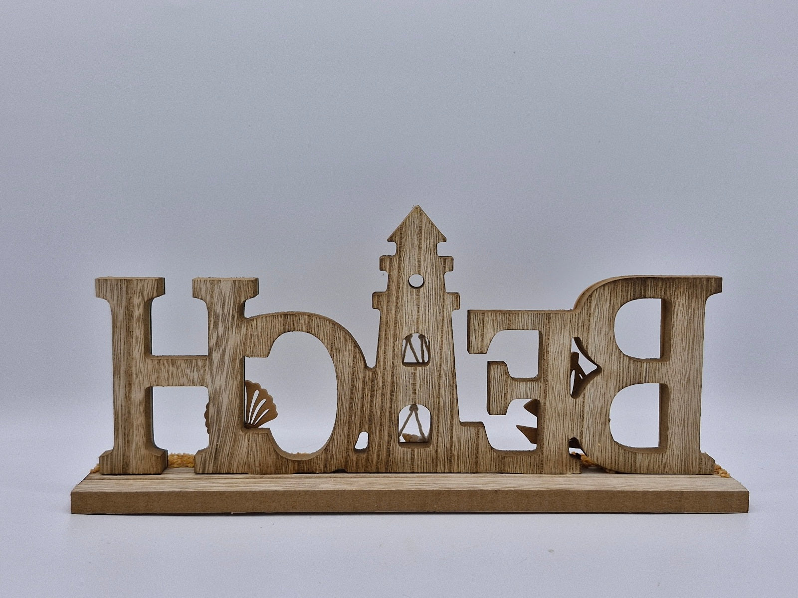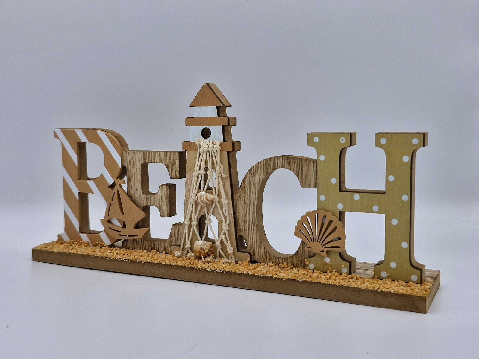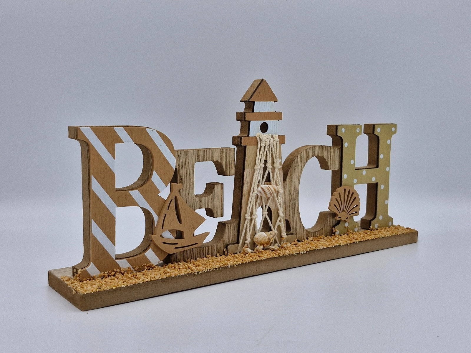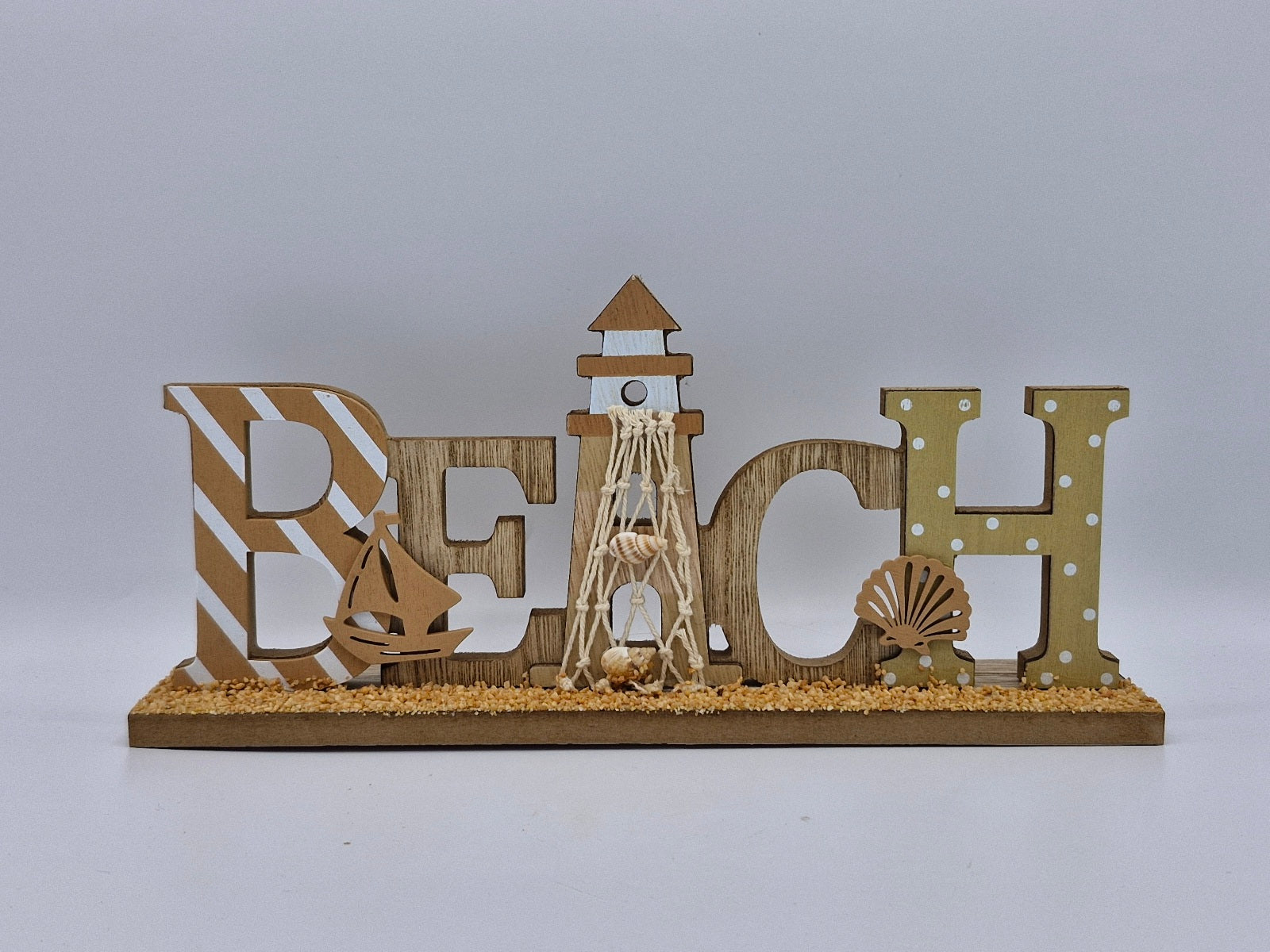 This elegant wooden 'Beach' decoration rests on a sturdy base adorned with natural sand evoking the charm of the seaside. The centrepiece features the letter ‘a’ uniquely crafted as a lighthouse, complete with intricate net and shell detailing, adding a refined coastal touch to any décor. Perfect for enhancing a living space with subtle sophistication and a coastal ambiance.